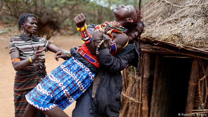 A young Pokot girl is held by a member of her community as she tries to escape a forced marriage, unaware of the arrangements her father had made.