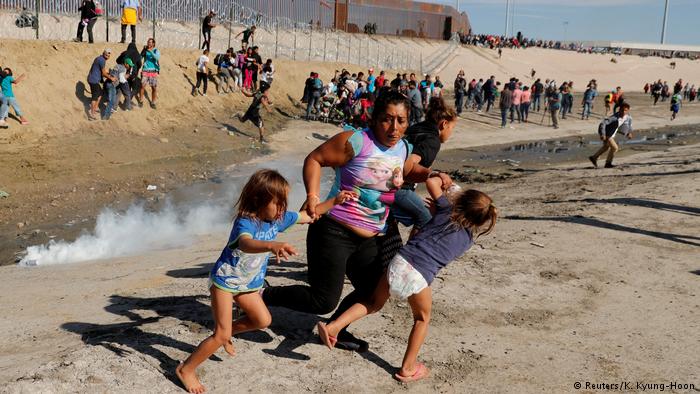In the shot, taken on Sunday, you can see Honduran mother Maria Meza grabbing the thin arms of her two 5-year-old twin daughters Cheili and Saira as they frantically run from a tear gas canister spewing fumes.