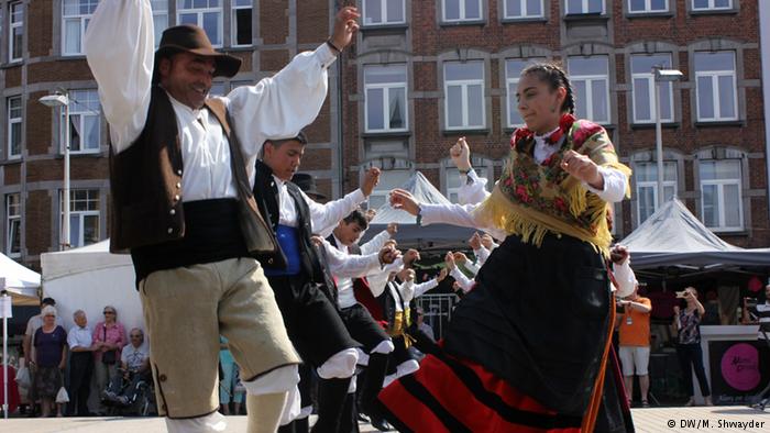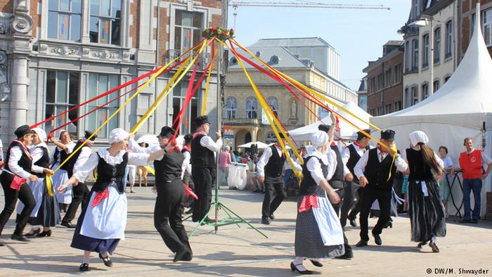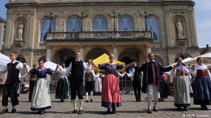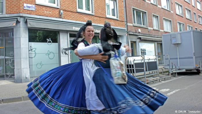 The Danish group “The Sprouts“ performs in front of the Théâtre Royal in Namur. “The Sprouts” are from Seeland near the Danish capital Copenhagen. All of their costumes are handmade, based on original designs, and sometimes incorporate old heirloom pieces that they inherited.