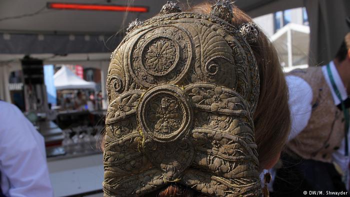 This hairpiece is called a “Riegelhaube” and it was part of a traditional costume for wealthy women in Munich in the 18th and 19th century. The earliest reference dates back to 1755. The piece the woman is wearing in the picture is 200 years old. The hairpieces were often decorated with precious gems, and could be big enough to cover the entire back of a woman’s head, from ear to ear.