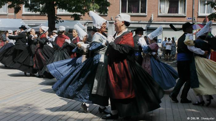 This performance is a collaboration of a couple of traditional French folklore dance groups, all from Brittany in France. All of them are wearing their own different traditional dresses. These groups specialize in Breton-style traditional dance.