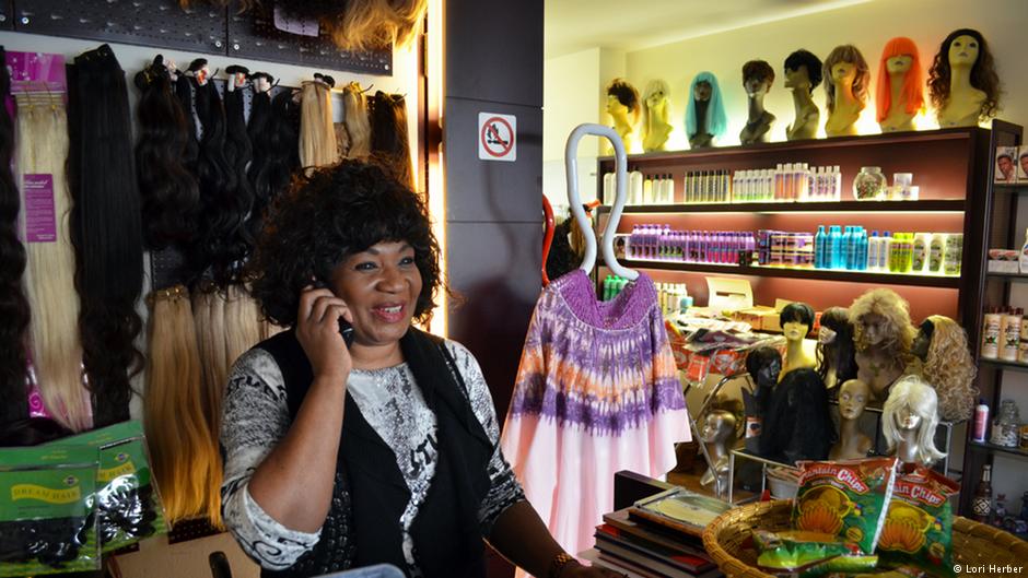 Zeebra Tropicana salon in Cologne is one of few specializing in Afro hair. Across from a rainbow of wigs, a wall of styling products looks like a Tetris game of hair creams, oils and sprays.