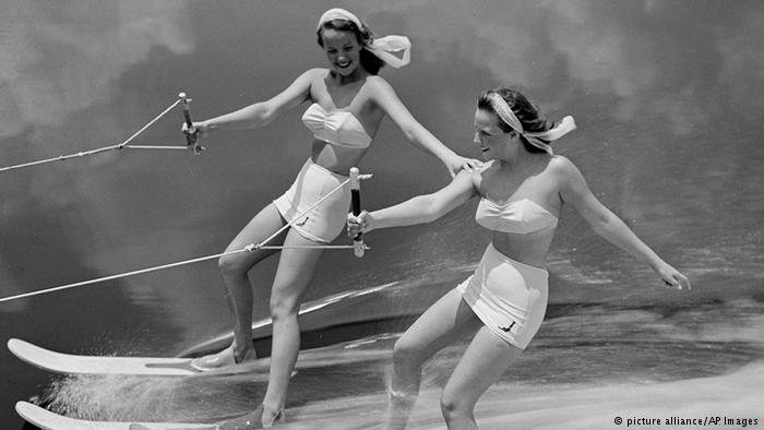 In the US in the 1950s, Hollywood’s recipe for success included bikini-clad swimmers performing water ballet and acrobatics on water skis. Here, two mermaids are pictured cooling off. Their tops look like they’re in constant danger of causing a dreaded nipple-gate, while their bikini bottoms appear able to withstand top speeds behind a water ski boat.