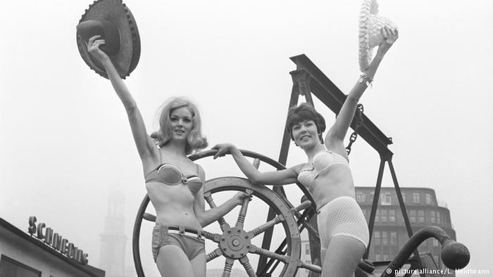 After figuring prominently in the Bond films, bikinis gained even greater mainstream acceptance. The latest styles were presented at the Hamburg harbor in 1963. The Capri model (left) bears a resemblance to Ursula Andress’ bikini. The Sissi model on the right is meant to have a more athletic touch – and be a bit more modest.