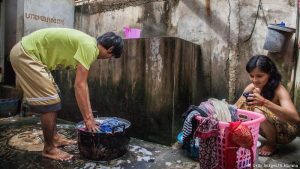 Two garment workers wash their clothes with water from an outdoor basin on April 7, 2014 in Phnom Penh, Cambodia.