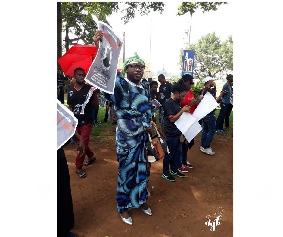 A man in a gomesi, a colorful floor-length dress. It is the most commonly used costume for women. Hundreds turned up to protest in a festive show of hope, democracy, defiance and power – the power held by ordinary people.