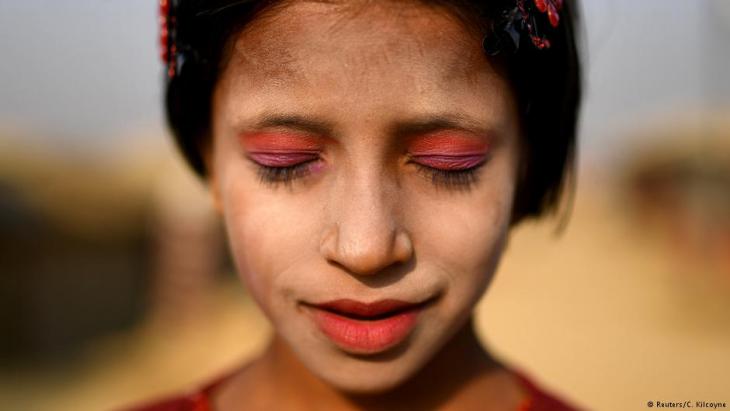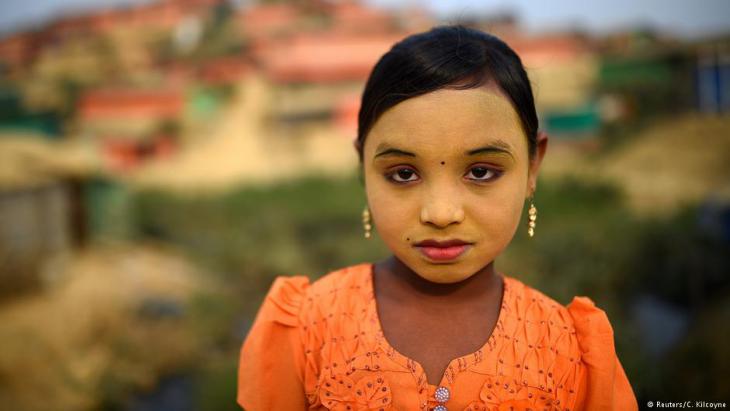 A Rohingya refugee girl named Senuara Begum, aged 14, poses for a photograph as she wears thanaka paste at Jamtoli camp in Cox’s Bazaar, Bangladesh, 1 April 2018. “I like the makeup,” says Senuara.