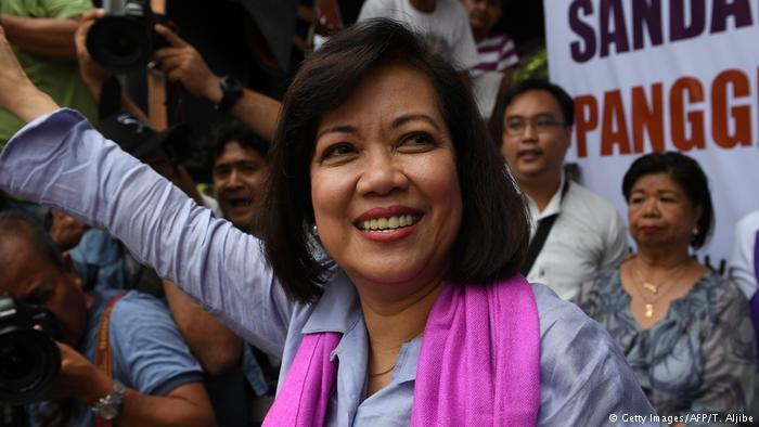 Ousted Philippine Supreme Court Chief Justice Maria Lourdes Sereno waves to supporters in front of the supreme court building in Manila on May 11, 2018.