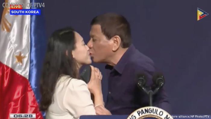 In this video from PTV taken Sunday, June 3, 2018, Philippines President Rodrigo Duterte leans in to kiss a Filipino worker at the podium during a town hall-style meeting with overseas Filipino workers in Seoul, South Korea.