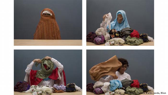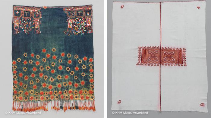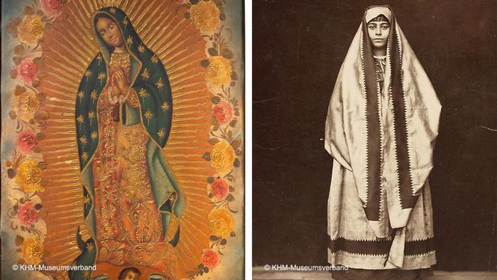The Weltmuseum’s exhibition includes not only artwork in which the headscarf figures, but also various headscarves themselves from around the world. And it’s not just women’s headscarves being shown; men’s are on display, too. Left is a Tunisian bridal veil from the mid-20th century, while the headscarf on the right with a double eagle design is for male members of a religious order in Guatemala.