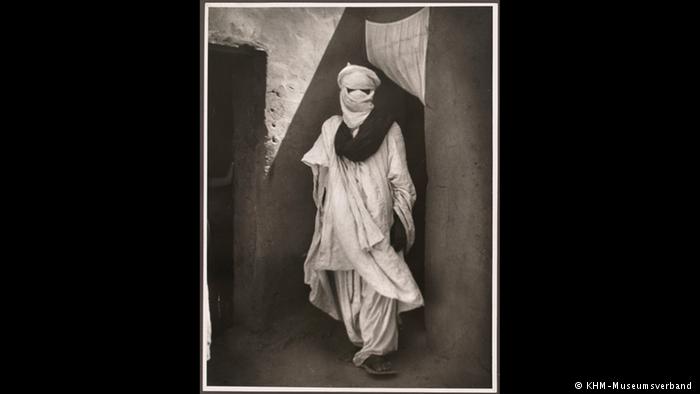 This photograph taken by the Viennese photographer Ludwig Gustav Alois Zöhrer shows a Tuareg man wearing the traditional face coverings of the North African nomadic pastoralists. The scarf, often indigo, is believed to keep away evil spirits. It is an important rite of passage into manhood when an adolescent male begins to wear it. Women, in contrast, do not usually cover their faces.