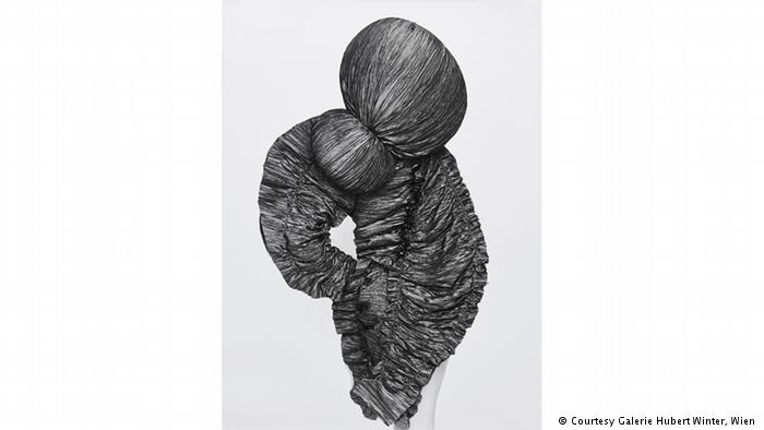 The Vienna exhibition also includes items that examine head coverings in an abstracted manner. This silver gelatin print by Austrian photographer Tina Lechner, entitled “Xiao,” recalls the back of a woman’s head covered by crinkly fabric that drapes down. Lechner is known for her sculptural-based photography that often examines cultural constructions of femininity in a quasi-surreal manner.