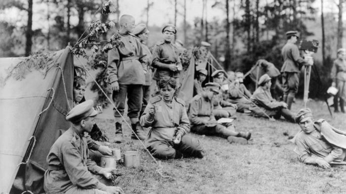 Women’s Regiment from Petrograd relaxing, drinking tea and eating, in front of their tents. Russian White Army, World War I. (c1918 Feb. 27) *** public domain