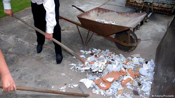 Couples in Germany typically opt for a small civil marriage followed by a larger church ceremony at a later date. In some communities a “polterabend” is celebrated, where friends of the couple break porcelain or ceramics in front of the bride’s home. The couple must clean up the mess together, symbolizing the necessity of teamwork.