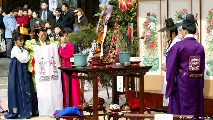 In South Korea, many young couples still opt for traditional weddings, even though they often also organize an extra western-style ceremony with a white wedding gown and black tuxedo. Prior to the ceremony, a series of gift-exchanges between the bride and groom, as well as members of the bride and groom’s families, must occur.