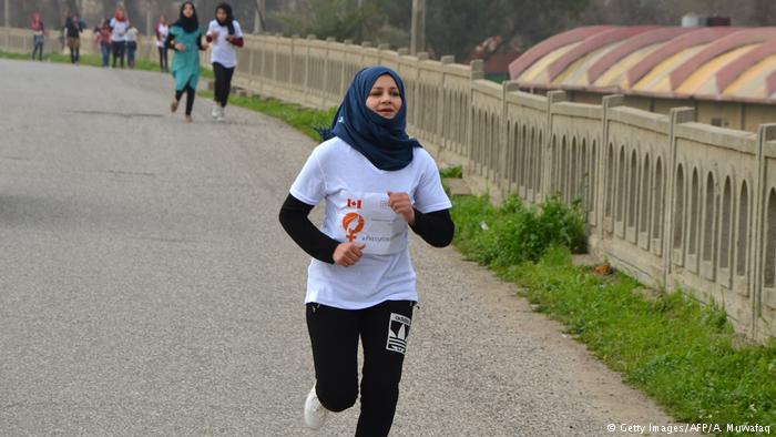 Iraqi women take part in a symbolic 900-metres marathon to mark Women’s Day in the former embattled city of Mosul on March 8, 2018 eight months after Iraqi forces retook the northern Iraqi city from Islamic State (IS) jihadists.