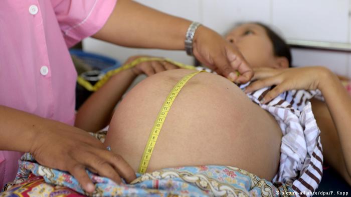 A nurse measures the size of the belly of a pregnant young woman, Sophi, in Bantey Meanchey province, Cambodia