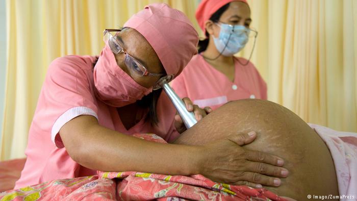A midwives at the Battambang Regional Hospital in Cambodia listen to the heartbeat of an unborn set of twins using a traditional method.