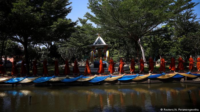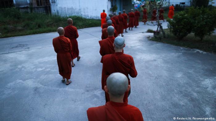 Novice monks walk in line to receive food offerings from people at the Songdhammakalyani monastery, Nakhon Pathom province, Thailand, December 7, 2018.