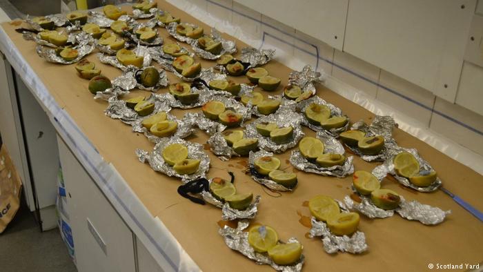 Forty limes used in spells meant to silence people involved in the investigation. Photo supplied by Scotland Yard