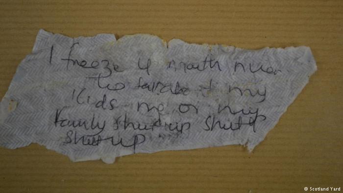 One of the notes found inside the limes used to try to silence the investigation. Photo supplied by Scotland Yard